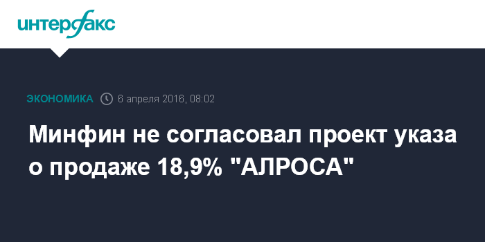 Москва. 6 апреля. INTERFAX.RU - Минфин РФ не согласен с предложением Минэкономразвития о продаже в рамках приватизации 18,9% акций "АЛРОСА", министерство настаивает на том, что к продаже может быть предложен лишь пакет в 10,9%, сообщил "Интерфаксу" источник в финансово-экономическом блоке правительства, знакомый с письмом министра финансов Антона Силуанова министру экономического развития Алексею Улюкаеву.