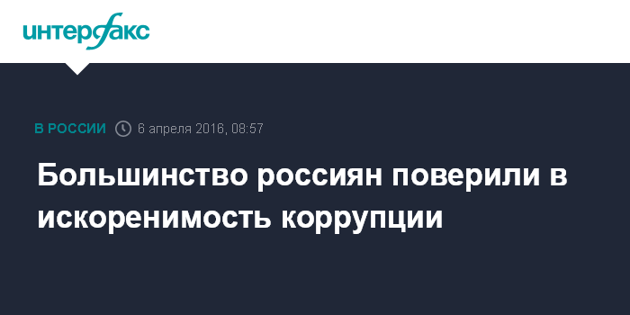Москва. 6 апреля. INTERFAX.RU - Масштабы коррупции и взяточничества в РФ, по мнению россиян, можно существенно уменьшить (56%) или даже полностью искоренить эти явления (15%), сообщили "Интерфаксу" в "Левада-Центре".