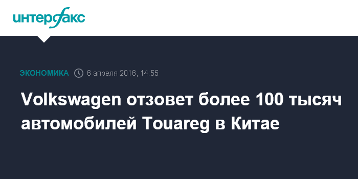 Москва. 6 апреля. INTERFAX.RU - Германский автопроизводитель Volkswagen отзывает с китайского рынка 103,569 тыс. внедорожников Touareg, сообщило Главное госуправление КНР по техническому и карантинному контролю за качеством товаров.