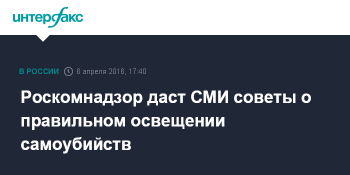 Москва. 6 апреля. INTERFAX.RU - Рекомендации по освещению суицидов в средствах массовой информации будут подготовлены к концу мая, сообщил официальный представитель Роскомнадзора Вадим Ампелонский.