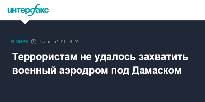 Москва. 6 апреля. INTERFAX.RU - Боевики из запрещенной в РФ террористической организации "Исламское государство" пытались захватить военный аэродром недалеко от Дамаска, но понесли потери и отступили, информирует Центр по примирению враждующих сторон на территории Сирии.