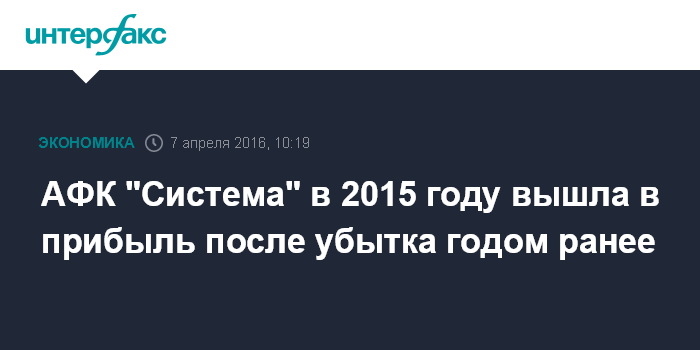 Москва. 7 апреля. INTERFAX.RU - Чистая прибыль АФК "Система" по МСФО в 2015 году составила 33,6 млрд рублей против 156,2 млрд рублей убытка годом ранее.
