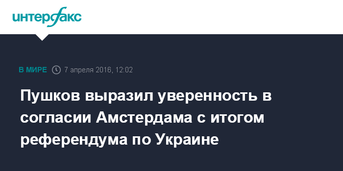 Москва. 7 апреля. INTERFAX.RU - Результаты референдума в Нидерландах показывают, что граждане этой страны понимают, что ассоциация Украины с Евросоюзом будет тормозить развитие европейских государств, и голландское правительство не сможет проигнорировать волеизъявление населения, заявил председатель комитета Госдумы по международным делам Алексей Пушков.