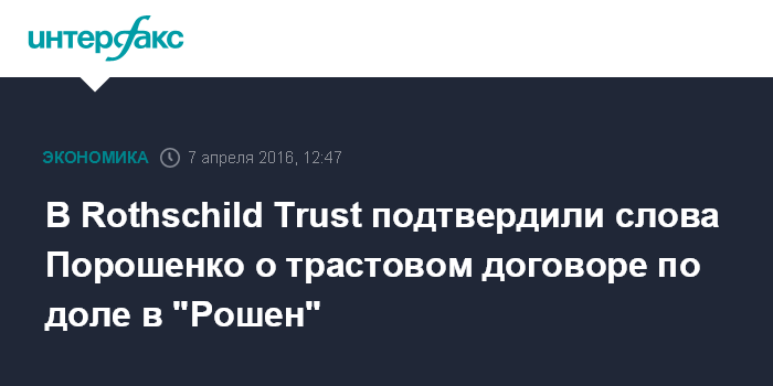 Москва. 7 апреля. INTERFAX.RU - Президент Украины Петр Порошенко назначил Rothschild Trust доверенным лицом (trustee) в "слепом" трасте (blind trust) по управлению его долей в кондитерской корпорации "Рошен".