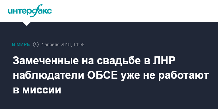 Москва. 7 апреля. INTERFAX.RU - Наблюдатели Специальной мониторинговой миссии (СММ) ОБСЕ на Украине, которые были замечены на свадьбе представителей самопровозглашенной ЛНР, больше не работают в миссии.