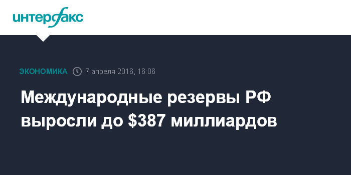 Москва. 7 апреля. INTERFAX.RU - Международные резервы России на первое апреля составили $387,0 млрд, сообщил Банк России.