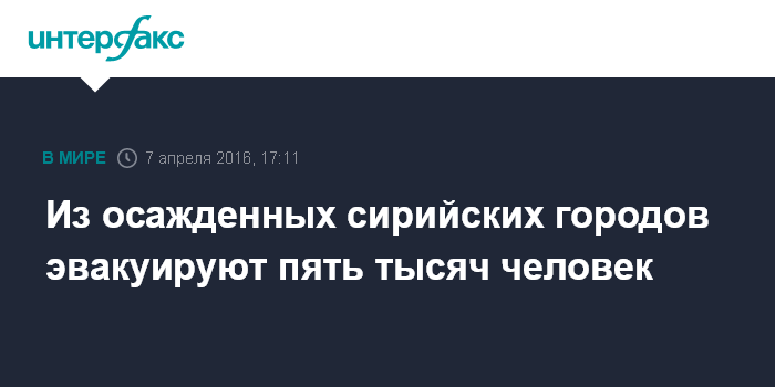 Москва. 7 апреля. INTERFAX.RU - Почти 5 тысяч больных и раненых планируется эвакуировать в ближайшее время из четырех осажденных сирийских городов - Мадайи, Эз-Забадани, Аль-Фуа и Кефрайи, сообщают в четверг западные СМИ со ссылкой на специального советника генсека ООН Яна Эгеланна.