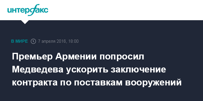Москва. 7 апреля. INTERFAX.RU - Армянский премьер-министр Овик Абраамян просит российского коллегу Дмитрия Медведева дать указания Рособоронэкспорту ускорить заключение контракта, связанного с поставками военной продукции Армении.