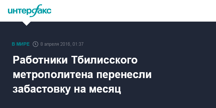 Москва. 8 апреля. INTERFAX.RU - Работники Тбилисского метрополитена, планировавшие на 8 апреля забастовку с требованием повышения зарплаты, в связи с решением городского суда приняли решение отложить свою акцию на месяц.