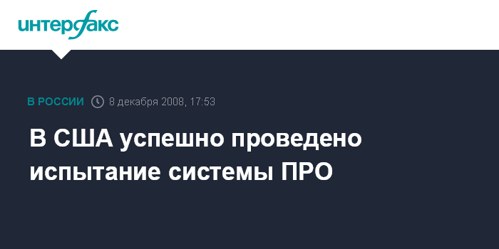 Москва. 8 декабря. INTERFAX.RU - Соединенные Штаты провели испытание системы ПРО, предназначенной для перехвата баллистических ракет дальнего радиуса действия, сообщила британская телерадиовещательная корпорация BBC со ссылкой на информацию Пентагона.