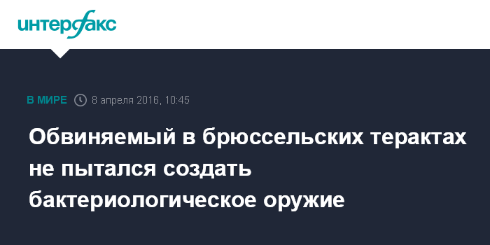 Москва. 8 апреля. INTERFAX.RU - Федеральная прокуратура Бельгии опровергла сообщения о том, что обвиняемый в причастности к брюссельским терактам Абдерман Амеруд, пытался изготовить бактериологическое оружие, пишет в пятницу газета Le Soir.