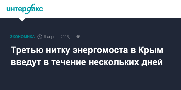 Москва. 8 апреля. INTERFAX.RU - Новая нитка энергомоста через Керченский пролив будет введена в ближайшее время, заявил вице-премьер Аркадий Дворкович в ходе итоговой коллегии Минэнерго.