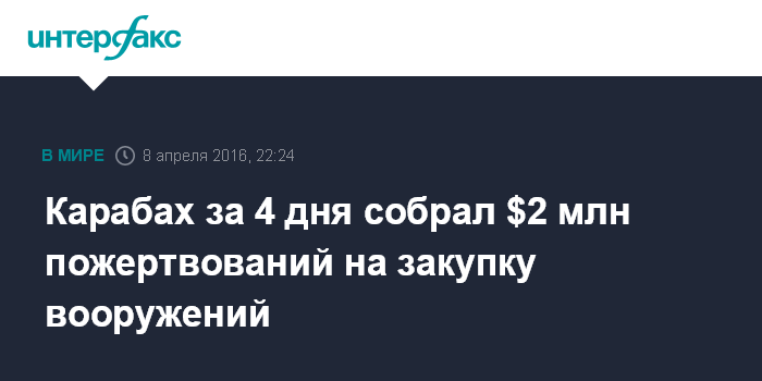 Москва. 8 апреля. INTERFAX.RU - Чуть более $2 миллионов поступило на открытые правительством непризнанной Нагорно-Карабахской республики (НКР) специальные счета в рамках сбора благотворительной помощи в связи с обострившимся в ночь на 2 апреля карабахским конфликтом.
