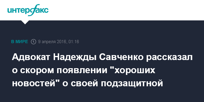 Москва. 9 апреля. INTERFAX.RU - Адвокат Илья Новиков в ближайшие дни ожидает хороших новостей о судьбе своей подзащитной украинской летчицы Надежды Савченко, которая приговорена судом в России к 22 годам заключения.