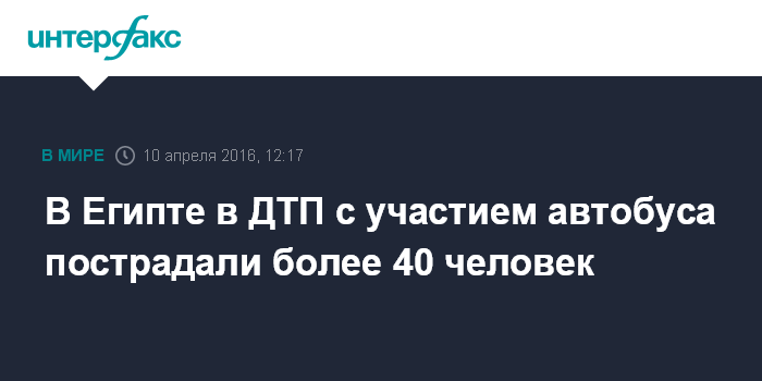 Москва. 10 апреля. INTERFAX.RU - Не менее 41 гражданина Египта пострадали в воскресенье после того, как на дороге перевернулся пассажирский автобус, сообщают местные СМИ.