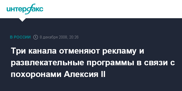 Москва. 8 декабря. INTERFAX.RU - Федеральные телеканалы в связи с похоронами патриарха Московского и всея Руси Алексия II во вторник, 9 декабря, снимут с эфира рекламу, а также развлекательные передачи.