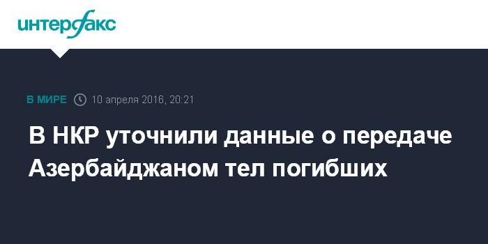 Москва. 10 апреля. INTERFAX.RU - Азербайджанская сторона передала в воскресенье представителям непризнанной Нагорно-Карабахской республики тела 18 военнослужащих, погибших в результате обострившегося в ночь на 2 апреля карабахского конфликта.