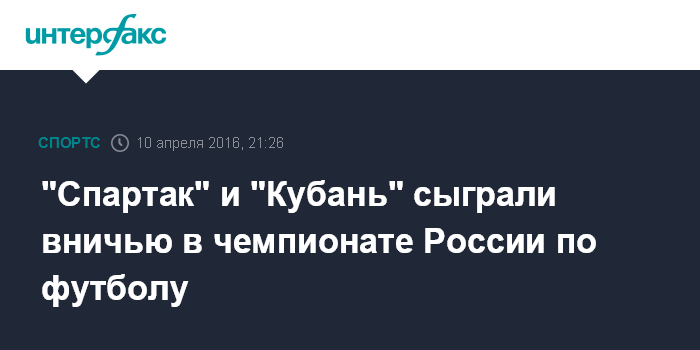 Москва. 10 апреля. INTERFAX.RU - Матч 23-го тура чемпионата России между московским ФК "Спартак" и краснодарской "Кубанью" завершился вничью. Результат встречи, прошедшей в Москве в воскресенье, - 2:2.
