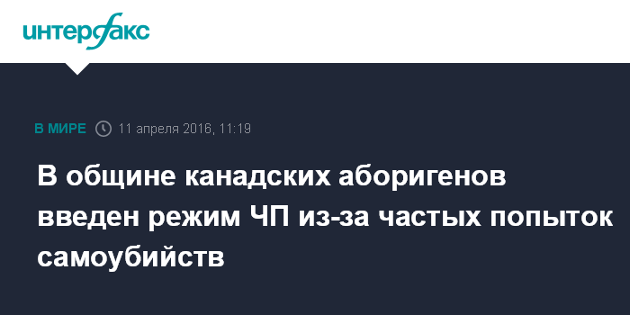 Москва. 11 апреля. INTERFAX.RU - В канадской провинции Онтарио община Аттавапискат объявила о введении чрезвычайного положения, поскольку за последние два месяца там было зафиксировано почти 40 попыток самоубийств, пишет газета канадская "Пресс".