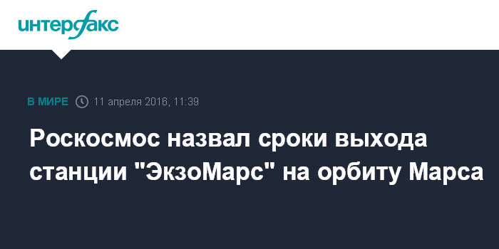 Москва. 11 апреля. INTERFAX.RU - Космический аппарат российско-европейской миссии "ЭкзоМарс-2016" достигнет орбиты Марса в середине октября 2016 года, заявил глава госкорпорации Роскосмос Игорь Комаров.