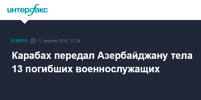 Москва. 11 апреля. INTERFAX.RU - Представители непризнанной Нагорно-Карабахской республики (НКР) передали Азербайджану в минувшее воскресенье тела 13 погибших военнослужащих, заявил пресс-секретарь министерства обороны НКР Сенор Асратян.
