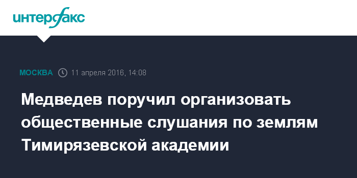 Москва. 11 апреля. INTERFAX.RU - Премьер РФ Дмитрий Медведев дал поручения Минсельхозу и Агентству по ипотечному жилищному кредитованию провести дополнительные общественные обсуждения по ситуации с отчуждением земель Тимирязевской сельхозакадемии.