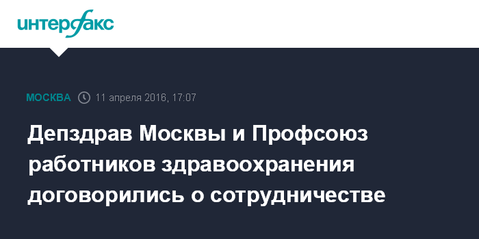 Москва. 11 апреля. INTERFAX.RU - Департамент здравоохранения Москвы и Профсоюз работников здравоохранения подписали двухгодичное соглашение о сотрудничестве.