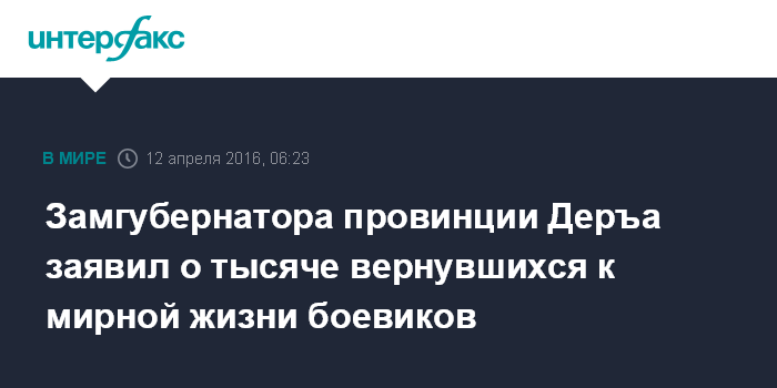 Москва. 12 апреля. INTERFAX.RU - Более 1 тыс. боевиков сдали оружие в провинции Деръа за полтора месяца, режим прекращения огня соблюдается как сирийской армией, так и незаконными вооруженными формированиями, сообщил журналистам во вторник заместитель губернатора провинции Авад Суидан.