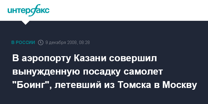 Москва. 9 декабря. INTERFAX.RU - Вынужденная посадка самолета Боинг-737 авиакомпании "Трансаэро" в Казани, летевшего по маршруту Томск - Москва, произошла после появления сигнала о неравномерном распределении топлива.