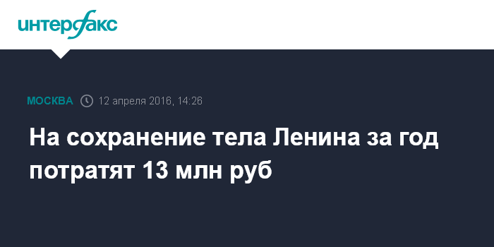 Москва. 12 апреля. INTERFAX.RU - Контракт на работы по сохранению прижизненного облика тела Владимира Ленина в 2016 году оценен в 13 млн рублей, сообщается на портале госзакупок во вторник.