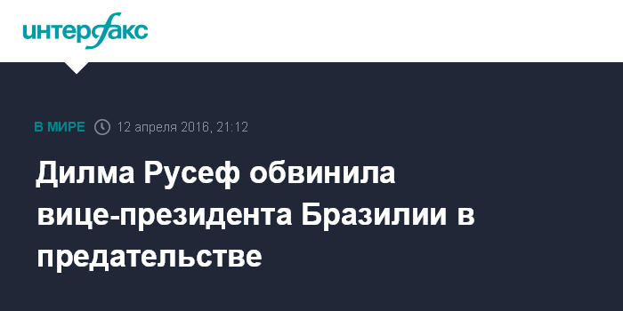 Москва. 12 апреля. INTERFAX.RU - Президент Бразилии Дилма Русеф назвала вице-президента страны Мишела Темера предателем, обвинив его в заговоре против нее и ее правительства.