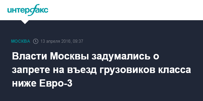 Москва. 13 апреля. INTERFAX.RU - Власти Москвы планируют в среднесрочной перспективе запретить въезд в центр столицы грузовиков экологического класса ниже Евро-3, сообщил глава департамента природопользования и охраны окружающей среды Антон Кульбачевский официальному порталу мэра и правительства города.