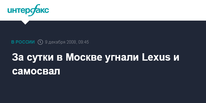 Москва. 9 декабря. INTERFAX.RU - За минувшие сутки в Москве угнали КамАЗ и Lexus общей стоимостью около 2,5 млн рублей, сообщил "Интерфаксу" источник в правоохранительных органах города во вторник.