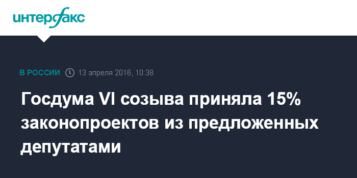 Москва. 13 апреля. INTERFAX.RU - Государственная Дума шестого созыва приняла только 15% законопроектов, которые были внесены депутатами, при этом была поддержана только треть законопроектов, инициированных депутатами от "Единой России", обладающей думским большинством.