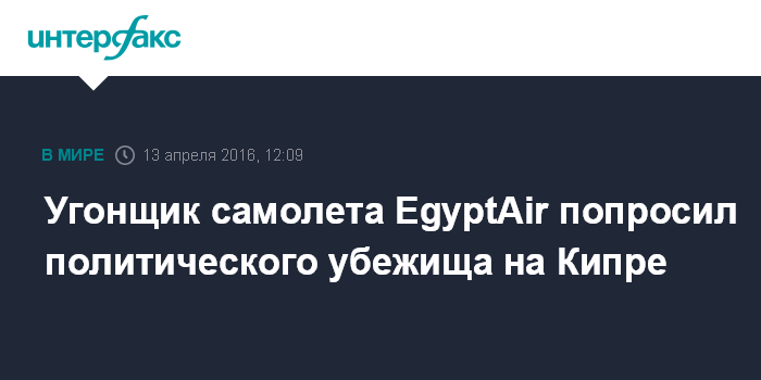 Москва. 13 апреля. INTERFAX.RU - Угонщик аэробуса компании EgyptAir Сейф ад-Дин Мустафа пытается получить политическое убежище на Кипре, сообщает в среду агентство Associated Press.