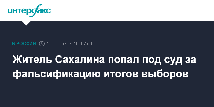 Москва. 14 апреля. INTERFAX.RU - Житель Южно-Сахалинска обвиняется в фальсификации итогов выборов депутатов Сахалинской облдумы в 2012 году в городе Корсакове, сообщает пресс-служба СУ СКР региона.