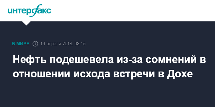Москва. 14 апреля. INTERFAX.RU - Цены на нефть снижаются на фоне сомнений многих участников рынка в результативности встречи нефтедобывающих стран в Дохе, сообщает агентство Bloomberg.