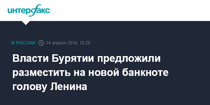 Москва. 14 апреля. INTERFAX.RU - Глава Бурятии Вячеслав Наговицын предложил разместить на новых банкнотах ЦБ РФ памятник Ленину на площади Советов в Улан-Удэ, Иволгинский дацан или Байкал, сообщает пресс-служба главы региона.