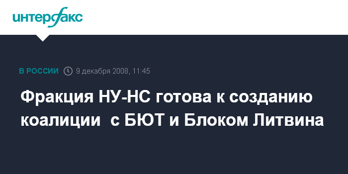 "Мы обязаны начать консультации по созданию другой коалиции (не в составе БЮТ и Партии регионов - ИФ), а именно коалиции в составе "Нашей Украины", Блока Литвина и Блока Тимошенко", - подчеркнул он, отметив, что необходимость такой коалиции вызвана тем, что возможность создания коалиции БЮТ - Партия регионов несет "угрозу для страны".
