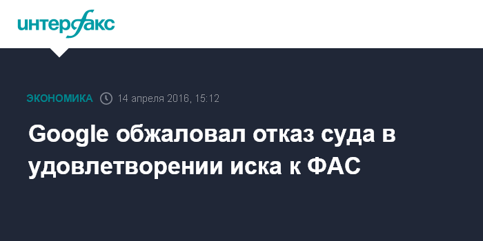 Москва. 14 апреля. INTERFAX.RU - Google обжаловал отказ арбитражного суда удовлетворить иск к Федеральной антимонопольной службе (ФАС), сообщил "Интерфаксу" представитель интернет-компании.
