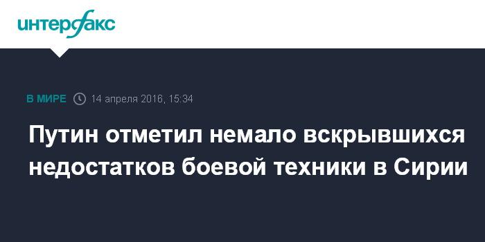 Москва. 14 апреля. INTERFAX.RU - Операция российских ВКС в Сирии выявила, в том числе, немало недостатков российской боевой техники, их сейчас анализируют специалисты, сообщил президент РФ Владимир Путин.