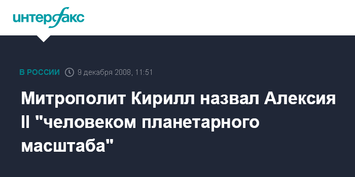 Москва. 9 декабря. INTERFAX.RU - Местоблюститель Московского патриаршего престола митрополит Кирилл назвал почившего патриарха Алексия II "человеком планетарного масштаба", который простирал "свое великое служение" далеко за пределы России.