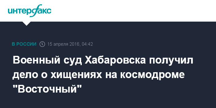 Москва. 15 апреля. INTERFAX.RU - Дело о хищениях более пяти млрд рублей при строительстве космодрома "Восточный", фигурантами которого стали экс-руководители ФГУП "Дальспестрой", передано в Дальневосточный окружной военный суд в Хабаровске.