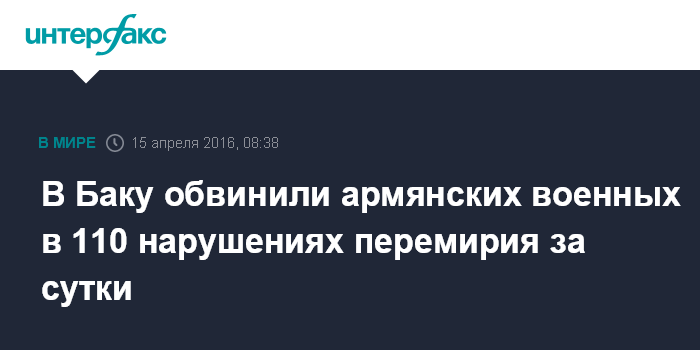 Москва. 15 апреля. INTERFAX.RU - Вооруженные силы Армении за сутки 110 раз нарушили режим прекращения огня на линии соприкосновения азербайджанских и армянских вооруженных сил с использованием 60-миллиметровых минометов, гранатометов и крупнокалиберных пулеметов, заявляет в пятницу пресс-служба Министерства обороны Азербайджана.