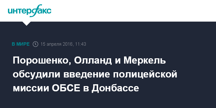 Москва. 15 апреля. INTERFAX.RU - Президент Украины Петр Порошенко в ходе телефонного разговора с президентом Франции Франсуа Олландом и канцлером Германии Ангелой Меркель скоординировал позиции относительно перспектив введения полицейской миссии ОБСЕ на Донбассе