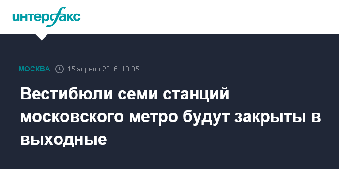 Москва. 15 апреля. INTERFAX.RU - В рамках программы благоустройства в предстоящие выходные будут закрыты вестибюли семи станций Московского метрополитена, сообщили "Интерфаксу" в пресс-службе подземки.