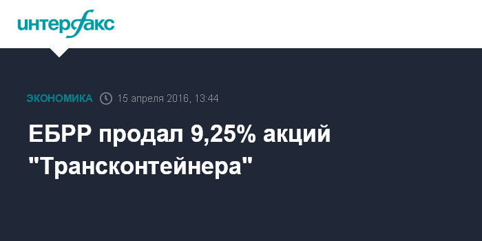 Москва. 15 апреля. INTERFAX.RU - Европейский банк реконструкции и развития (ЕБРР) продал 9,245% акций ПАО "Трансконтейнер", следует из сообщения железнодорожного оператора.
