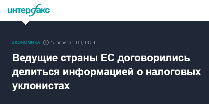 Москва. 15 апреля. INTERFAX.RU - Пять ведущих стран Европейского союза договорились об автоматическом обмене информацией относительно конечных выгодоприобретателей компаний и трастов, а также призвали "двадцатку" внедрить аналогичные стандарты, сообщает агентство Bloomberg.