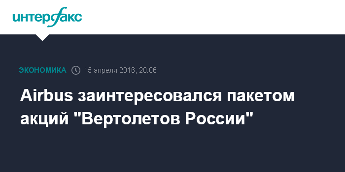 Москва. 15 апреля. INTERFAX.RU - Европейский авиастроительный концерн Airbus интересуется пакетом акций АО "Вертолеты России", заявил министр экономического развития РФ Алексей Улюкаев журналистам по итогам встречи с французскими деловыми кругами в пятницу в Париже.
