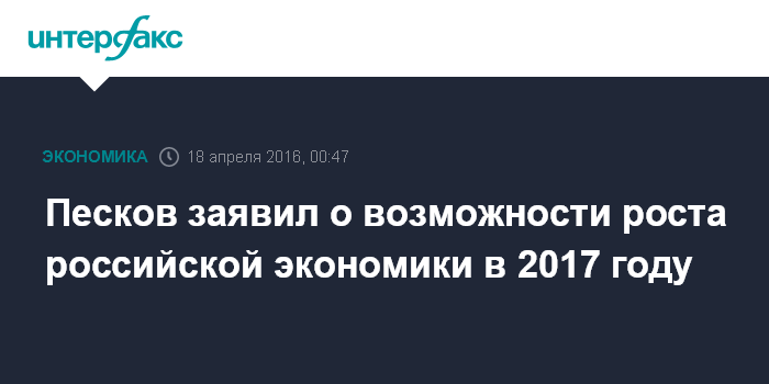 Москва. 18 апреля. INTERFAX.RU - Рост российской экономики может произойти в 2017 году, заявил пресс-секретарь президента РФ Дмитрий Песков в эфире телеканала "Россия 1".